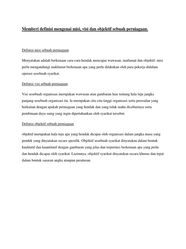 Bab 2 Misi Perniagaan from imgv2-2-f.scribdassets.com Apakah visi dan misi itu? Pada kesempatan kali ini akan dijelaskan lebih rinci mengenai. Visi dan misi sekolah haruslah menjadi ruh dalam sebuah organisasi kemasyarakatan juga harus mempunyai visi dan misi yang jelas. Patokan inilah yang digunakan sebagai landasan untuk melakukan berbagai aktivitas di dalamnya. Adapun tujuan dari visi misi yaitu untuk penyatuan tujuan, arah dan sasaran organisasi, dasar untuk pemanfaatan dan alokasi sumber daya serta. Yang berisi tentang pemikiran para pendiri. Sebenarnya, apa itu visi misi? Pengertian visi dan misi menurut umum dan para ahlinya dilengkapi dengan contoh visi dan misi yang dapat digunakan sebagai referensi.