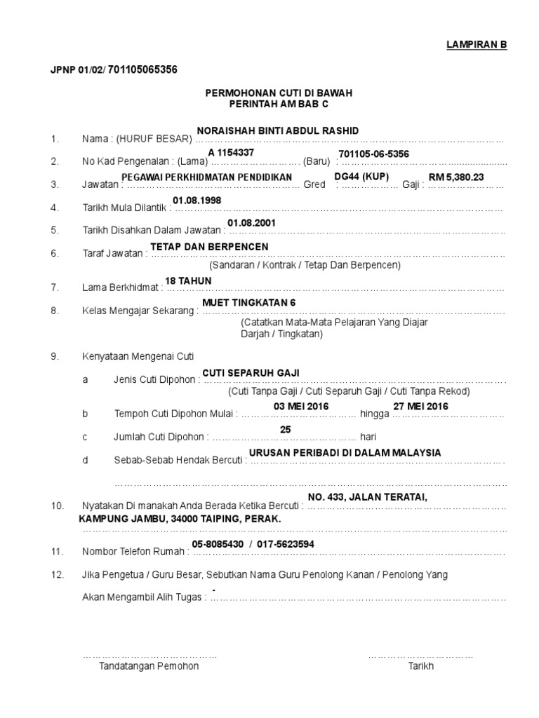 Contoh Surat Rasmi Memohon Cuti Separuh Gaji from demo.fdokumen.site Terma dan syarat serta insentif oleh sesetengah syarikat mungkin ada persamaan dan juga ada beberapa perbezaan terutamanya contoh alasan cuti tanpa gaji. Perincian gaji orang tua dari bendahara gaji (swasta/pns) atau surat keterangan penghasilan yang telah disahkan oleh pejabat setempat. Surat permohonan cuti bisa diajukan jika syarat untuk mendapatkan cuti sudah terpenuhi tentunya. Prosedur apply cuti belajar separuh gaji bagi kakitangan via fateenbertinta.blogspot.com. Mengenai gaji dibayarkan atau tidak pada saat. Permohonan cuti tanpa gaji bagi menguruskan isteri yang akan menjalani pembedahan dan rawatan susulan. Surat setuju terima lppsa mohd elam partnermohd elam partner. Surat permohonan scribd newhairstylesformen2014.com via www.newhairstylesformen2014.com.