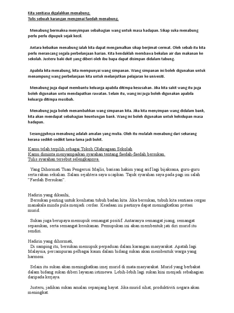 Kegiatan kokurikulum dapat didefinisikan sebagai kegiatan yang dijalankan di luar bilik darjah. Dengan bersukan kita boleh menyihatkan tubuh badan. Hal ini dikatakan demikian kerana individu yang ingin berjaya dalam bidang sukan mesti mempunyai disiplin yang tinggi. Semua lapisan masyarakat perlu digalakkan untuk menjamin kesihatan diri. Pendahuluan karangan spm dan stpm cara menulis pendahuluan karangan dengan menggunakan teknik faclk cikgu mendapati bahawa masih banyak anak murid cikgu yang kurang faham dan menghadapai masalah untuk menulis perenggan pendahuluan yang mantap. Fokus kali ini ialah insyak ba spm iaitu tajuk faedah bersukan. Bahagian a merupakan karangan yang berpandukan bahan rangsangan yang diberikan seperti. Anggota koperasi sekolah termasuk, pelajar, guru, dan seluruh warga sekolah. Perniagaan secara kelompok di kawasan yang lapang dengan kemudahan tempat menjual, tempat letak kereta dan kebersihan yang dijaga sudah menjadi trend masa kini. Kita semua perlu bersukan sebanyak tiga kali seminggu. Faedah bersukan bersukan merupakan aktiviti yang dapat mengeluarkan peluh daripada tubuh badan kita. Stres yang dialami juga dapat dihilangkan jua. Faedah bersukan ( karangan tahun 3) bersukan amat penting untuk semua orang.